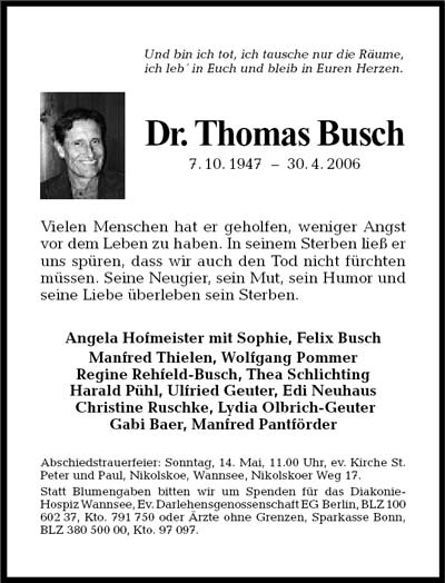 Am 30.4.06 ist Dr. phil. Dipl.-Psych. Thomas Busch nach langer Krankheit gestorben.