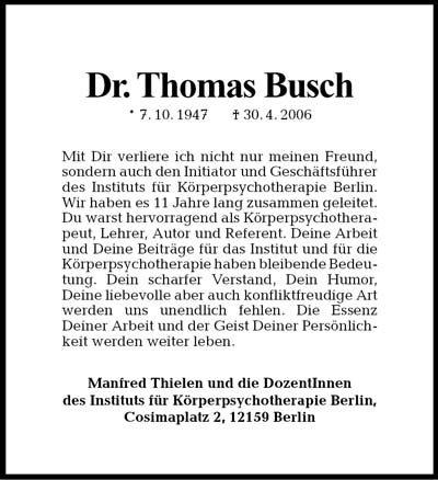 werden können“. Innerhalb der Körperpsychotherapie vertrat Thomas Busch eine integrative